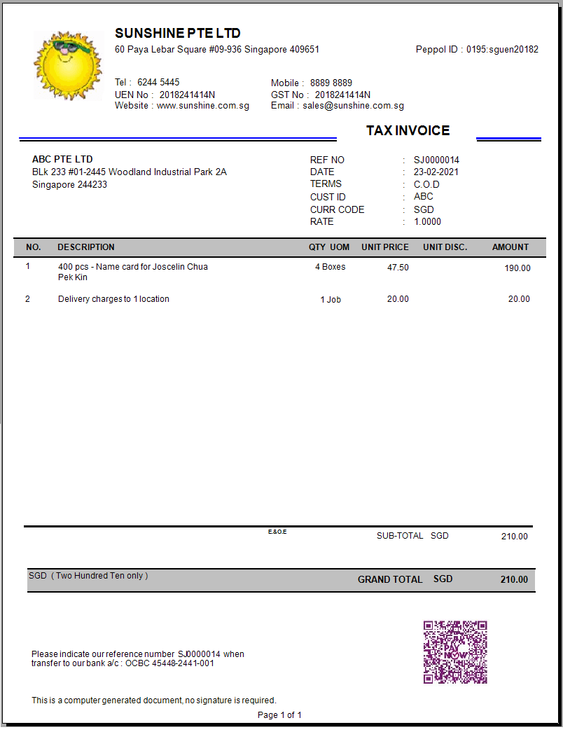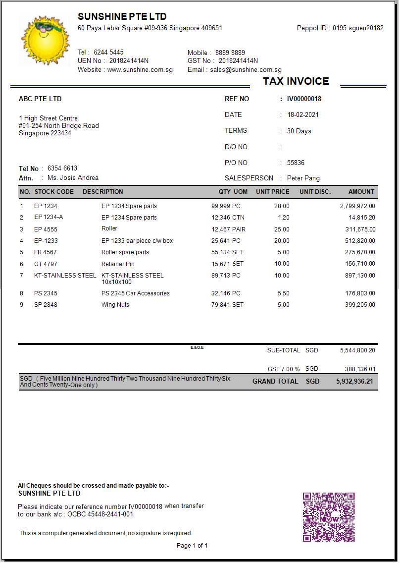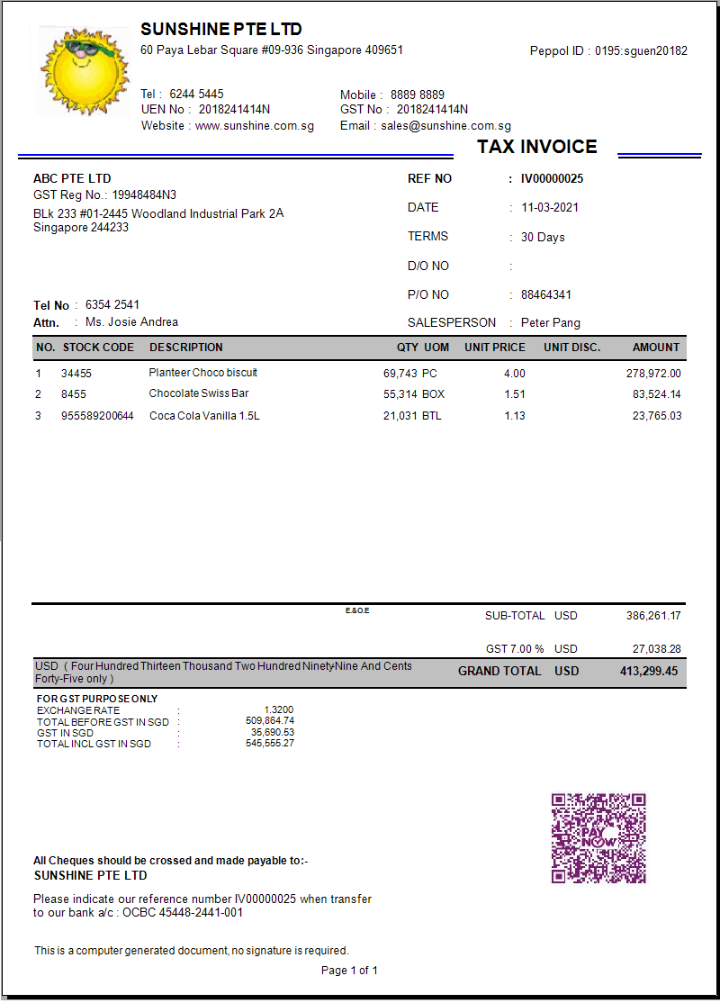 Customer invoice format supporting foreign currency transactions and exchange rates.