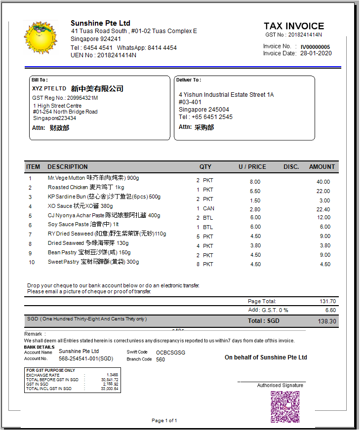 Customer invoice format supporting foreign currency transactions and exchange rates.